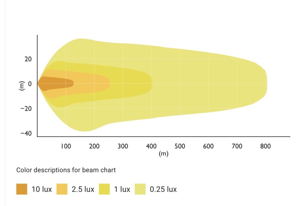 Bereik gemeten door het armatuur: 403 m @ 1 lux / 806 m @ 0,25 lux (Purelux PowerBoost®)