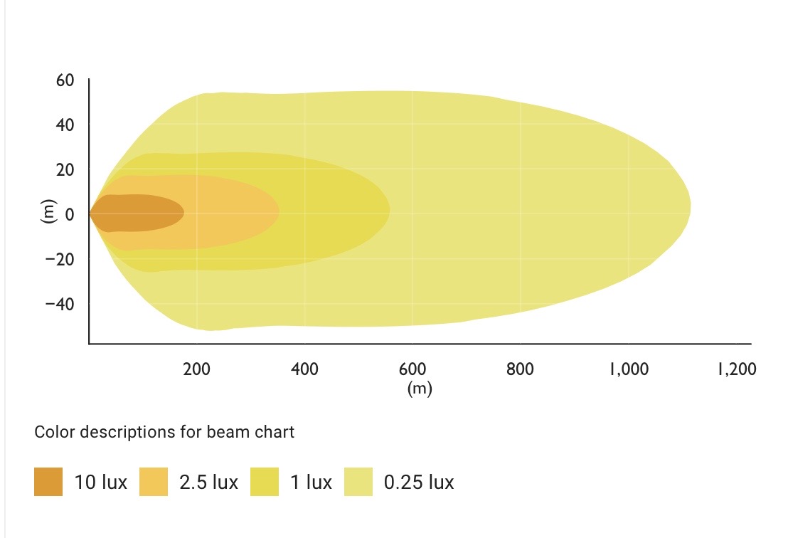 Bereik gemeten door het armatuur: 558 m @ 1 lux / 1116 m @ 0,25 lux (Purelux PowerBoost®)