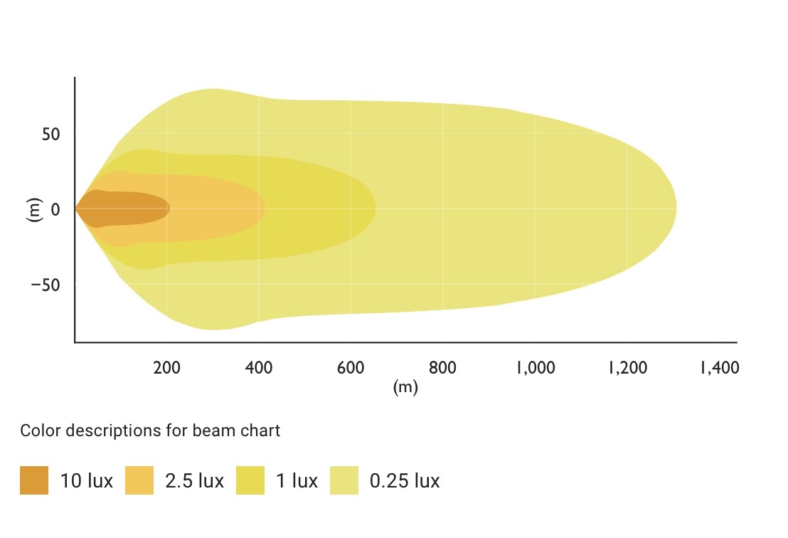 Bereik gemeten door de lamp: 410 m @ 1 lux / 820 m @ 0,25 lux (Wegmodus)